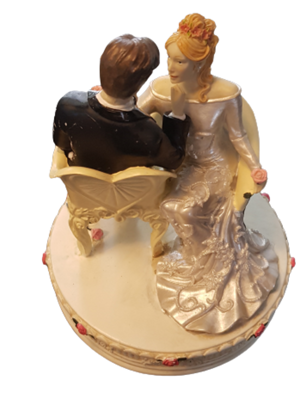 Bruidspaar zittend op een stoel.