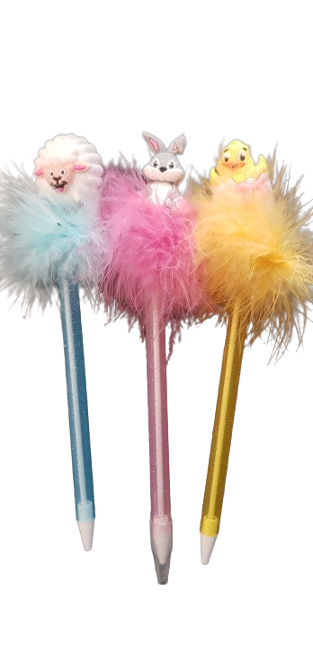 Op de pennen zit een kuiken , schaapje en paashaas met veertjes